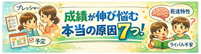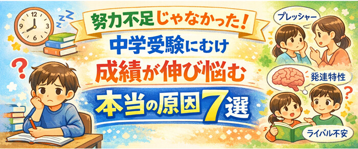 中ここでは、中学受験にむけ成績が伸び悩む代表的な7つの原因を整理し、親御さんが感情ではなく状況を冷静に見直すための視点をお伝えします。