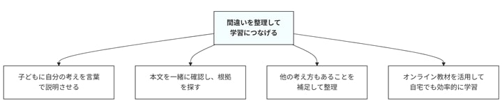 読解問題で間違えたとき「どうしてこの答えにしたの?」と聞くだけで、子どもの思考プロセスを理解できます。間違いは成長のチャンスです。
